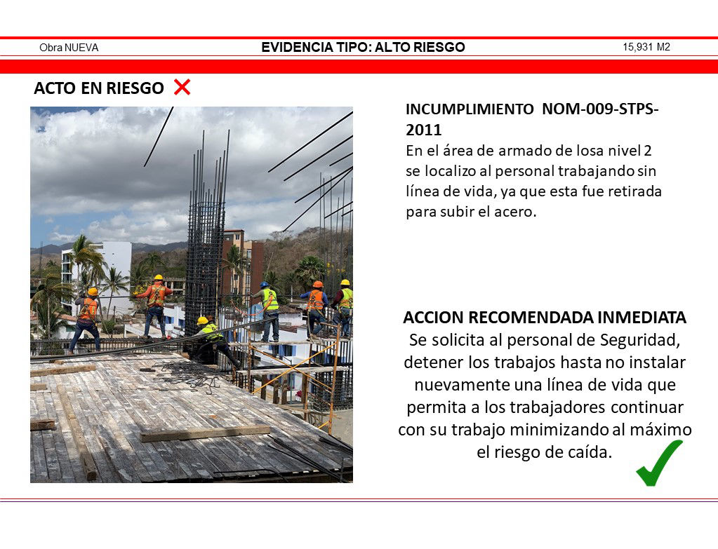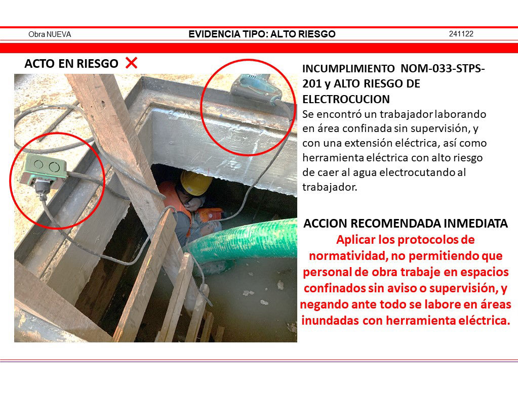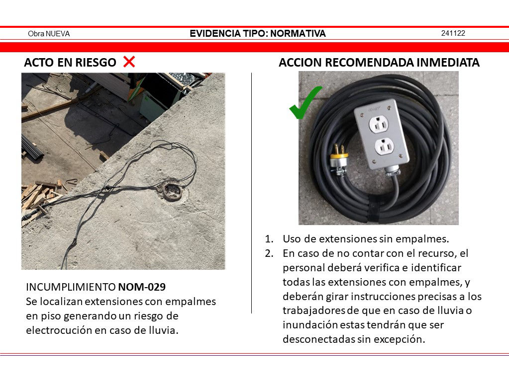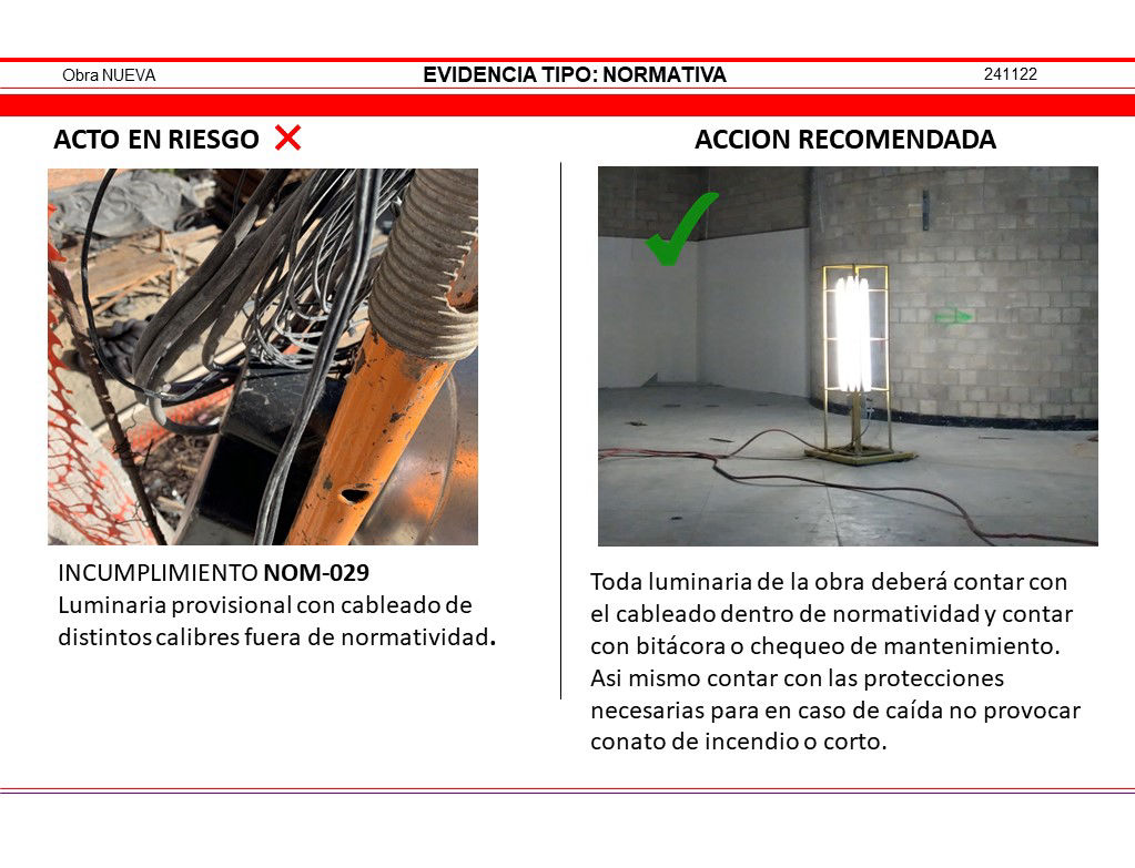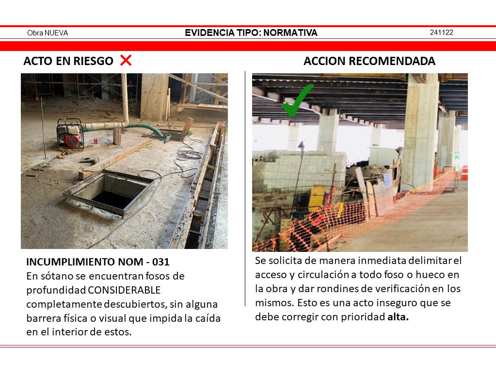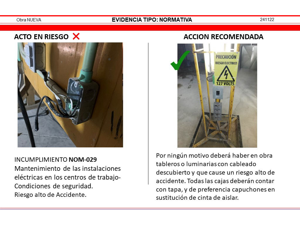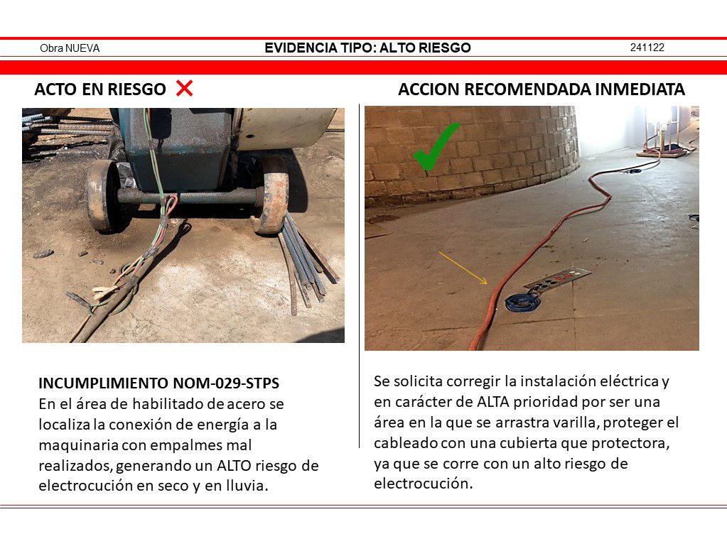 La omisión en la corrección de las siguientes evidencias es un riesgo alto de suspension de la obra por parte de las autoridades, así como un gran causante de peridas monetarias, y de riesgo de fallecimiento para el personal.