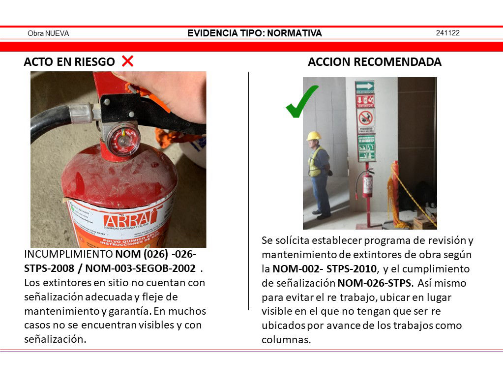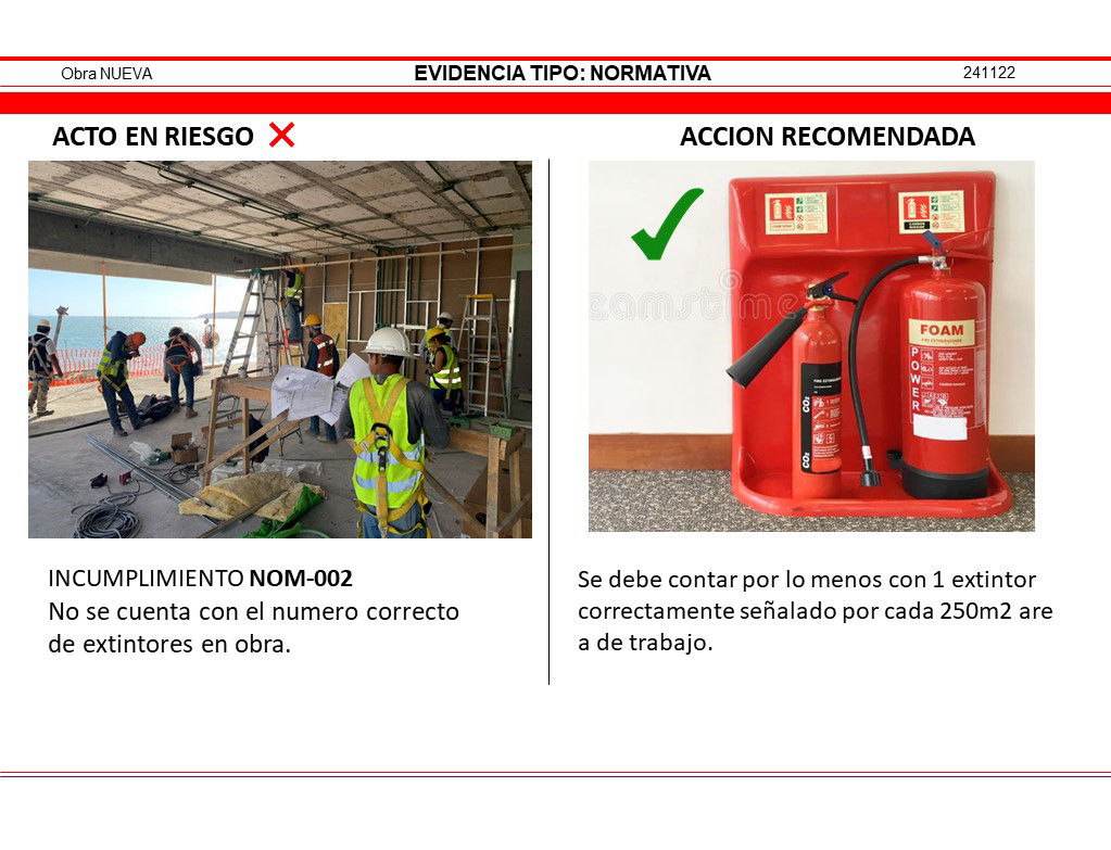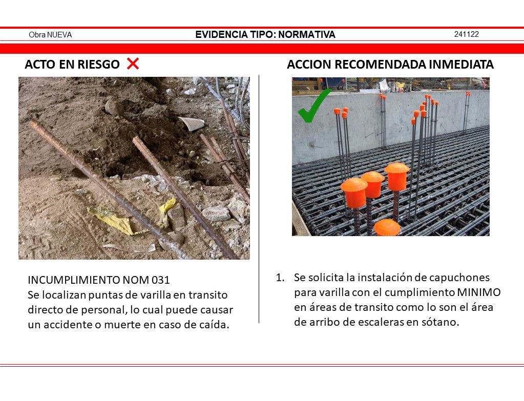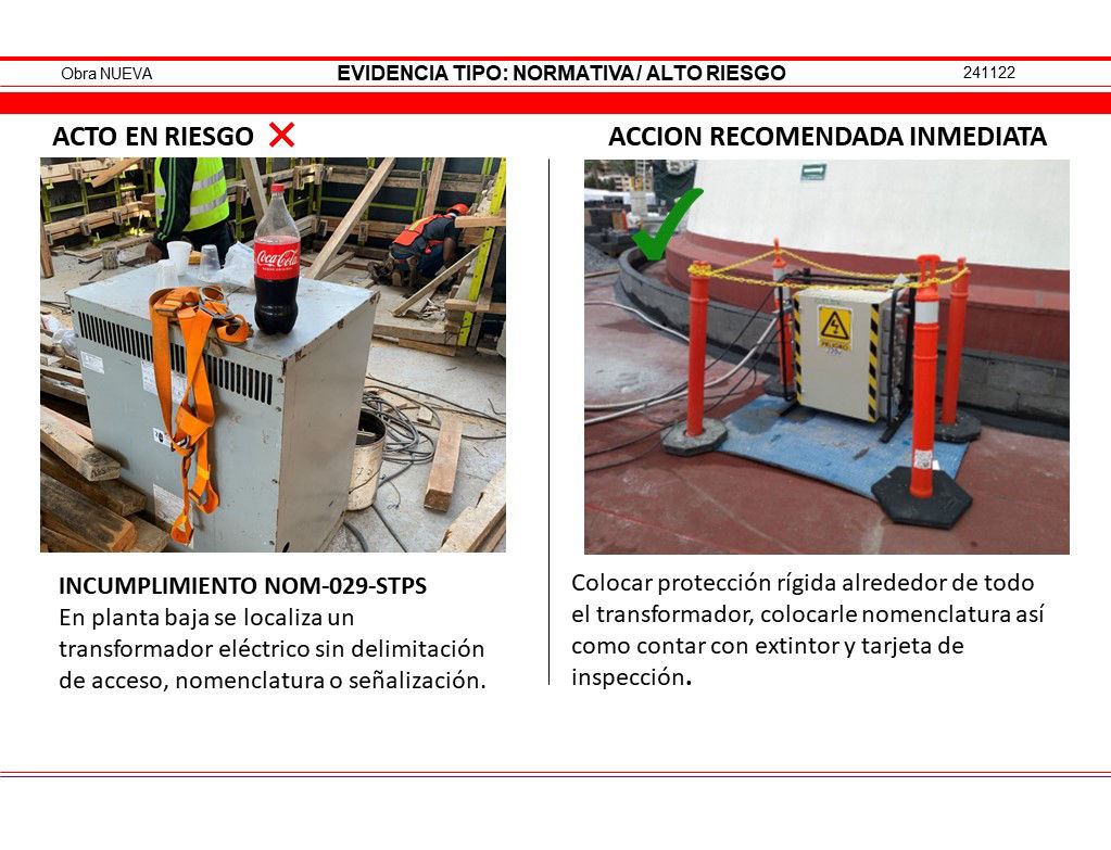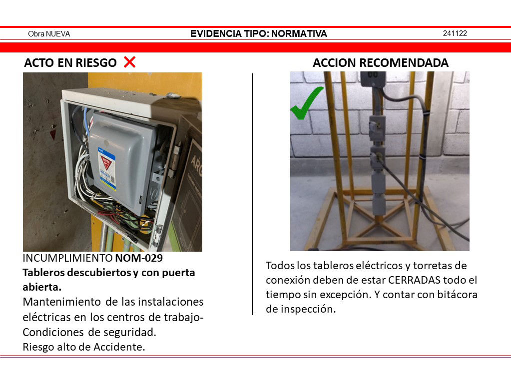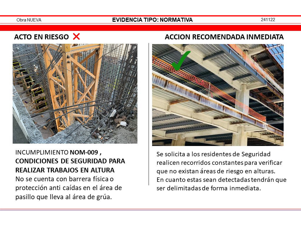 La omisión en la corrección de las siguientes evidencias es un riesgo alto de suspension de la obra por parte de las autoridades, así como un gran causante de peridas monetarias, y de riesgo de fallecimiento para el personal.