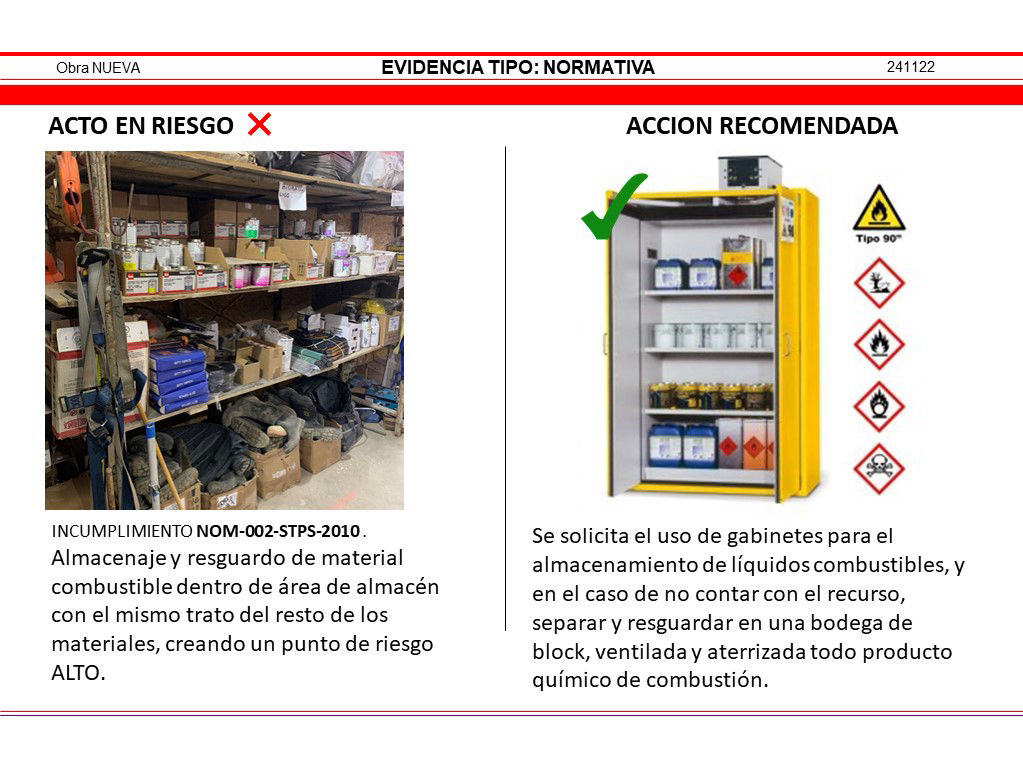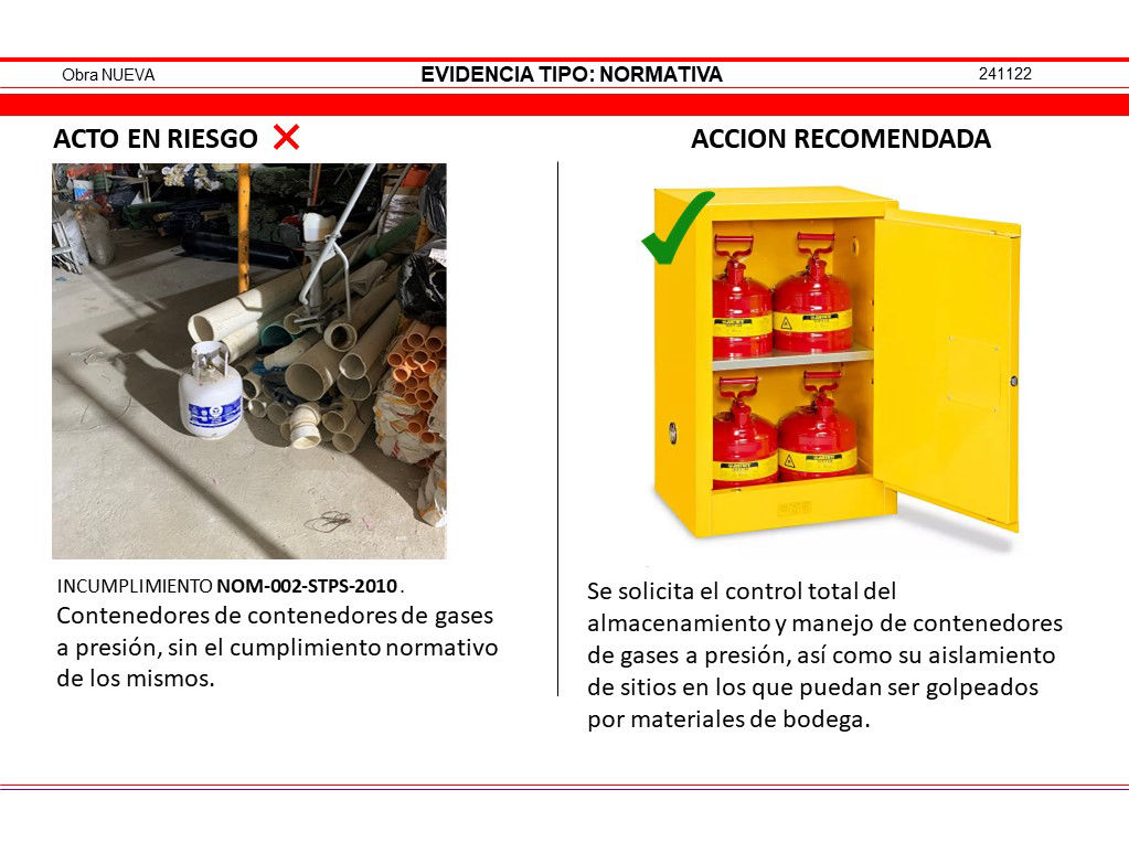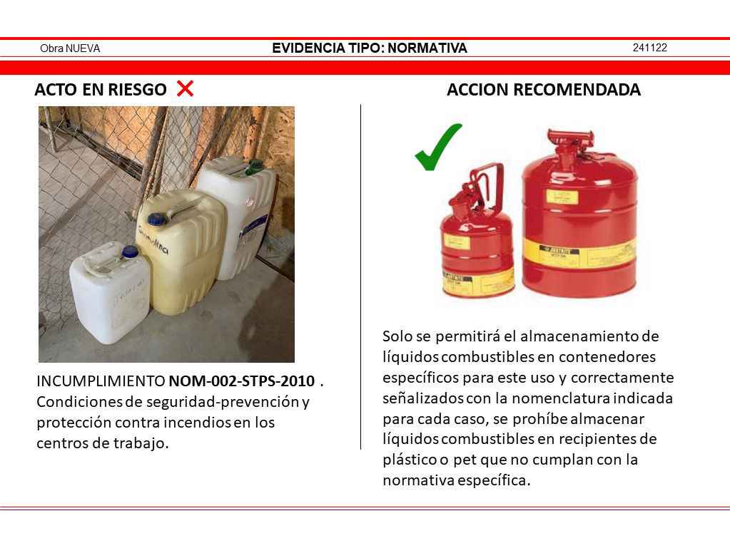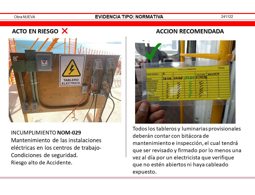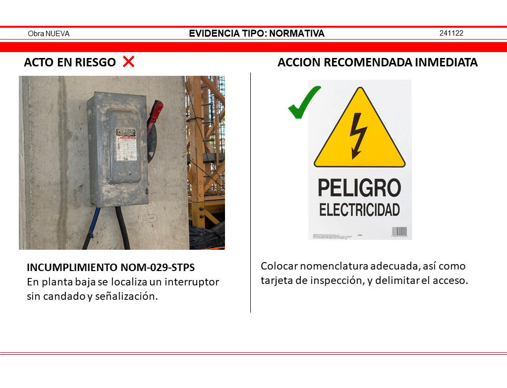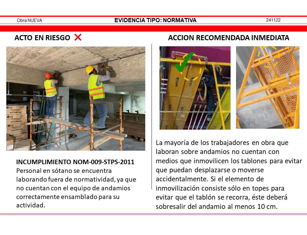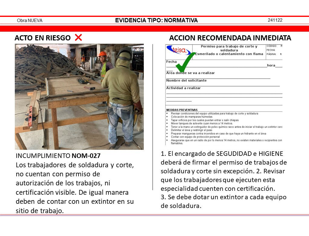 La omisión en la corrección de las siguientes evidencias es un riesgo alto de suspension de la obra por parte de las autoridades, así como un gran causante de peridas monetarias, y de riesgo de fallecimiento para el personal.
